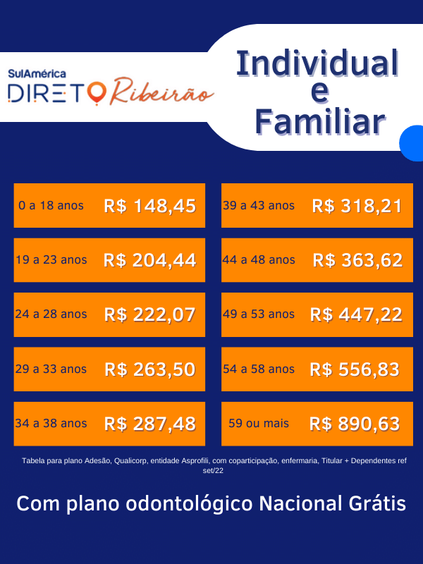 Referente ao plano de saúde SulAmérica Direto Ribeirão Rpreto, preço Individual, na modalidade Adesão, para a faixa etária de 0 à 18 anos, coparticipativo, pela administradora qualicorp, entidade Asprofili.