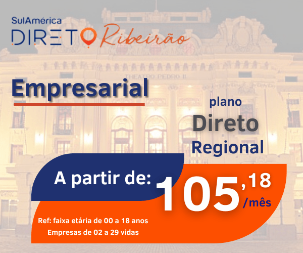 Preço Plano de saúde Ribeirão Preto SulAmérica Direto, preço empresarial compulsório, para a faixa etária de 0 à 18 anos, coparticipativo, com atendimento nas cidades: Barrinha, Brodowski, Cravinhos, Dumont, Jardinópolis, Pontal, Pradópolis, Ribeirão Preto, Serra Azul, Serrana, Sertãozinho, Jaboticabal, Batatais, Pitangueiras e Guariba.