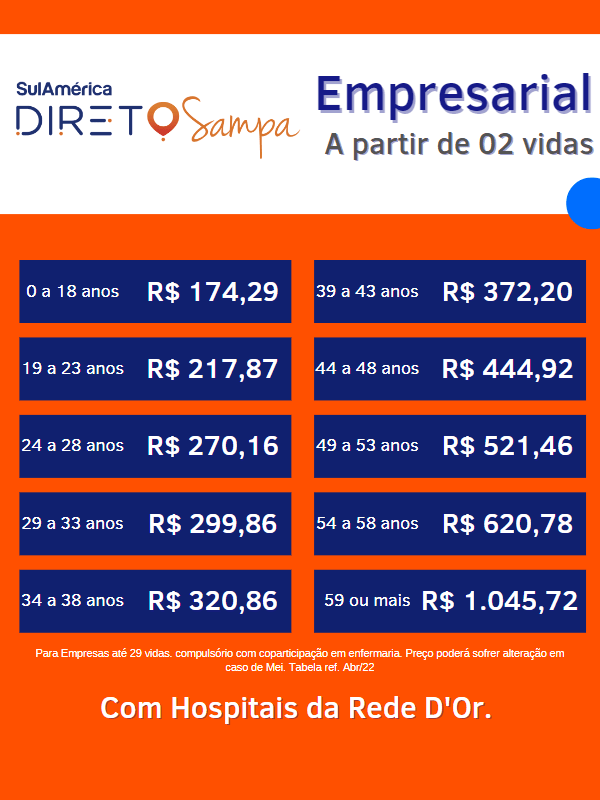 Tabela de preços plano de saúde SulAmérica Direto Sampa Empresarial ref. abr/22. Plano Direto Sampa Enfermaria com coparticipação, compulsório para empresas de 2 a 29 vidas..