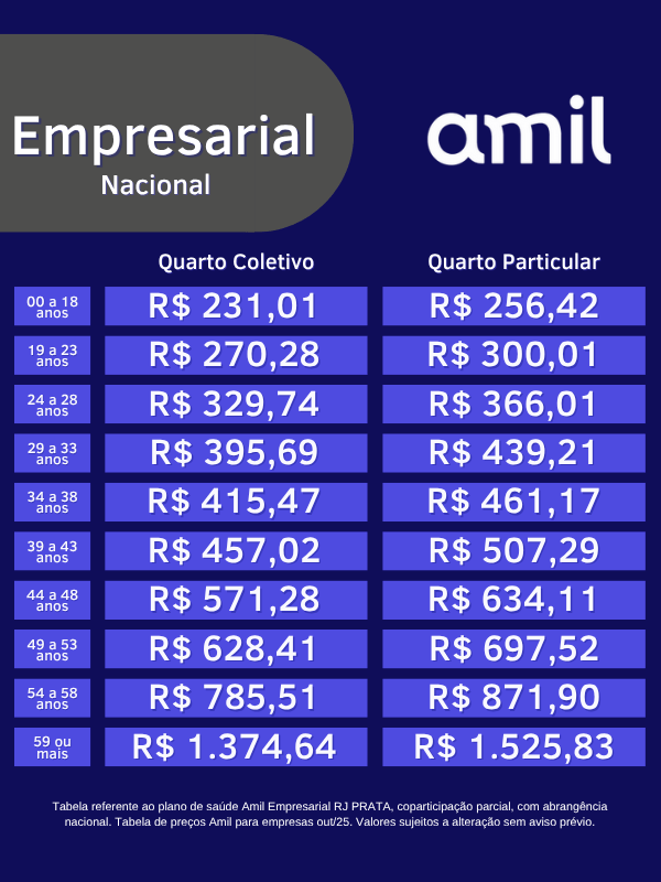 Tabela de preços plano de saúde Amil Empresarial PRATA no Rio de Janeiro, com cobertura Nacional, em acomodação coletiva, coparticipativo. Tabela ref. OUT/2025.
