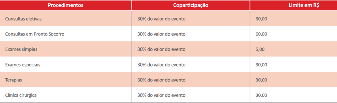 A Bradesco oferece na modalidade coparticipativa, limitador de evento, onde o custo de coparticipação é de 30% do valor do procedimento, mas com um teto de coparticipação a ser pago a operadora.