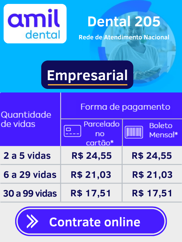 A linha 205 do plano Amil Dental Empresarial contempla tudo que você e seus funcionários precisam para cuidar da saúde bucal. Como grande diferencial, o Amil Dental empresa possui pagamento no boleto mensal e não possui prazo de carência para comer a utilização.