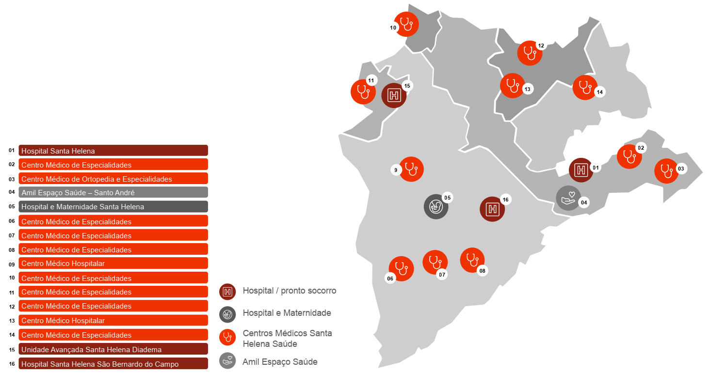 A Santa Helena Saúde oferece em São Paulo na região do grande ABC, nas cidades São Bernardo do Campo, São Caetano do Sul, Santo André, Diadema, Mauá e Ribeirão Pires, convênios médicos empresariais e individuais.
